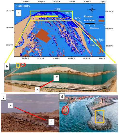 - El-Asmar, H.M.; Taha, M.M.N.; El-Sorogy, A.S. Morphodynamic Changes as an Impact of Human Intervention at the Ras El-Bar-Damietta Harbor Coast, NW Damietta Promontory, Nile Delta, Egypt. J. Afr. Earth Sci. 2016, 124, 323–339. [Google Scholar] [CrossRef]