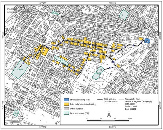 Figure 3 represents the part of the strategic urban system used as a case study. The authors identified the municipal building of Gioia Tauro as the SB, three EAs (EA-01, EA-02, EA-04), as well as the strategic road network. The analyzed strategic road network is made up of 17 stretches. The authors identified the stretches by a number from 1 to 17. EA-01, EA-02, and EA-04 had extensions of 0.86 ha, 0.22 ha, and 0.35 ha, respectively.