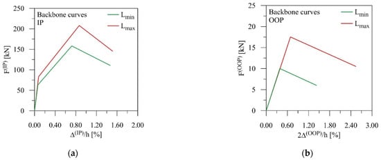 Due to their typical thickness range, MIs can exhibit significant OOP strength after the first macro-crack. Sufficient contact area between the cracked masonry and surrounding structural elements guarantees the OOP arching effect. The arch strength increases with higher panel thickness and compressive masonry strength. The OOP backbone curve F(OOP) − Δ(OOP) (Figure 11b) is bilinear. The formulation in [24] has been proven to offer reliable estimations of the OOP stiffness in the cracking stage [26]. Therefore, it is applied to evaluate the secant-to-peak stiffness kw1(OOP) (first branch). The maximum OOP strength FwFAA(OOP) depends on the degree of lateral contact between the panel and structural elements. FEMA 356 [49] provides a safe-sided lower bound expression, which accounts for one-way vertical arching only. This assumption is realistic, since the existing structures may be affected by the contact deterioration. The second OOP branch represents the softening behavior until collapse (FwRS(OOP), ΔwRS(OOP)). The residual OOP strength FwRS(OOP) and failure displacement ΔwRS(OOP) are calibrated based on experimental tests on panels of the same thickness [31]. Figure 12 summarizes the IP and OOP backbone curves referring to the two possible geometrical configurations due to the different bay lengths (Lmin = 4 m and Lmax = 7 m). As shown, the strength values of the IP and OOP backbone curves corresponding to Lmax (red lines) are higher than those obtained for Lmin (green lines), with the displacements being equal. This kind of behavior can be interpreted by observing that the IP strength of the MIs depends on the equivalent strut width, whose value increases with the diagonal length of the panel; the same applies for the OOP strength, which is related to the length and height of the infill panel.