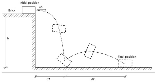 The extension of the obstruction area generated by the collapse of MIs in RC-framed buildings depends on the maximum distance achievable by the debris during its fall. This movement (Figure 13) is made up of two rates: d1, which is evaluated considering the bullet motion; and d2, which according to empirical studies [51] is twice d1.