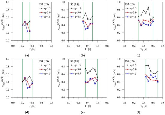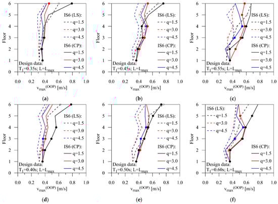Comparison of OOP velocity values at the LS and CP limit states when L = Lmax: (a) T1 = 0.35s; (b) T1 = 0.40s; (c) T1 = 0.45s; (d) T1 = 0.50s; (e) T1 = 0.55s; (f) T1 = 0.60s.