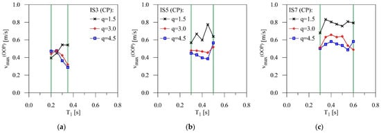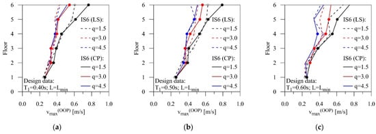 Comparison of the OOP velocity values at the LS and CP limit states when L = Lmin: (a) T1 = 0.40 s; (b) T1 = 0.50 s; (c) T1 = 0.60 s.
