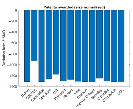 - Patents awarded (size-normalized): the number of patents assigned to inventors working at the university over the respective reference period, computed per 1.000 students to take into consideration the size of the institution.