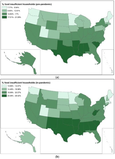 Percentages of food insufficient households before (a) and during (b) the pandemic. (Note: all percentages were calculated with weighted data).