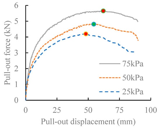 The break was set when the pull-out displacement reached 90 mm. In the pull-out tests with the corresponding normal stresses of 25 kPa, 50 kPa and 75 kPa, the maximum pull-out forces were 4.197 kN, 4.811 kN and 5.649 kN, respectively, at 48.149 mm, 53.946 mm and 62.101 mm. The maximum pull-out force increased with the increase in normal stress.