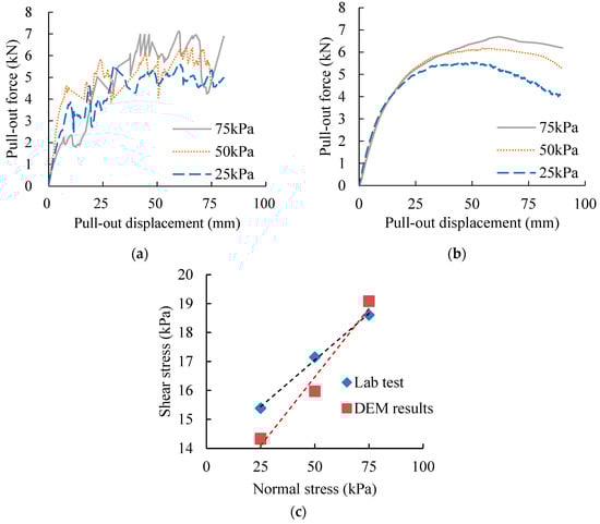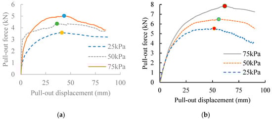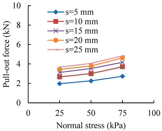Figure 5. The pull-out force increased with the increase in normal stress. The soil particles were continuously compacted and squeezed under larger normal stress; then, the immobilization effect was fully activated, resulting in the pull-out force increasing with the increase in normal stress. It can also be seen that the pull-out force increased with the increase in displacement before it reached the peak, it then went down with further displacement.