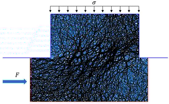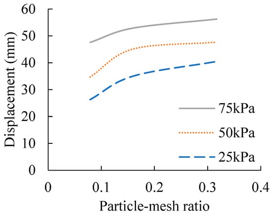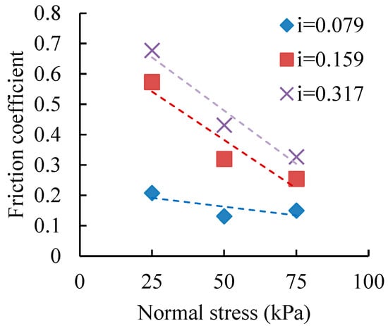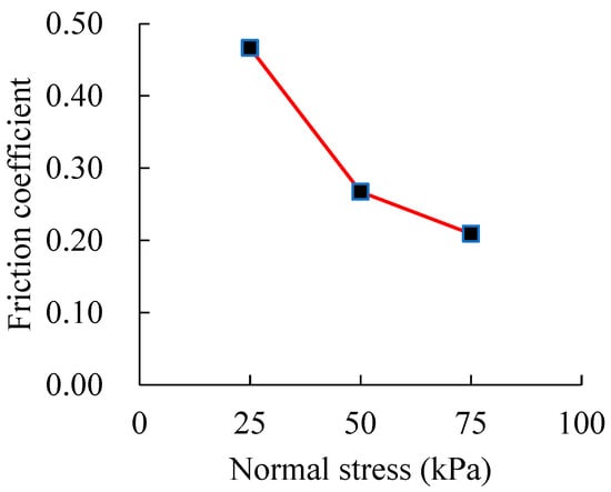 Figure 15 that as the normal stress decreased, the friction coefficient gradually increased. When the particle–mesh ratio was 0.159, it decreased from 0.573 at 25 kPa to 0.254 at 75 kPa. This conclusion was the same as that from the study of the interfacial-friction coefficient under the laboratory pull-out test. Under the condition of 25 kPa normal stress, the interface friction coefficients were 0.208, 0.573 and 0.678 when the ratios were 0.079, 0.159 and 0.317, respectively. They changed to 0.131, 0.319 and 0.432 when the normal stress was 50 kPa, and 0.150, 0.254 and 0.327 when the normal stress was 75 kPa.