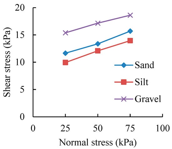 23]. In contrast, the friction is larger than the occlusion with silt and sand. Therefore, the shear stress of the geogrid in the gravel was greater than that of the pull-out test in the silt.