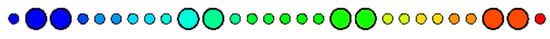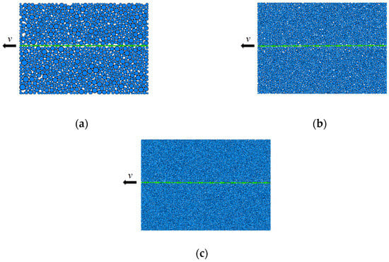 The mesh size of the biaxial geogrid was 32 mm × 33 mm. As 2D software was used, the mesh size of the grid was simplified to be 30 mm × 30 mm, which was defined as the equivalent mesh size to the 30 mm mesh. The reinforced area of the geogrid remained unchanged when the particle size changed, in order to eliminate any influence on the results. On the assumption that the area of reinforcement remains unchanged, changing the particle size of the filler particles changes the contact area between the grid and the filler, resulting in a change in friction. To completely eliminate the effect of changing friction on the test results, the coefficient of friction was set to zero. At this time, the pull-out force was the embedded force between the geogrid ribs and the filler. Under this premise, the influence of filler particle size on the reinforcement characteristics of the geogrid was explored. At the same time, the particle–pore ratio was defined as the ratio of the average particle size of the filler to the equivalent mesh size of the geogrid, as shown in Equation (1).