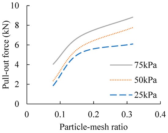 The pull-out force increases with the increase in normal stress. When the particle–mesh ratio was 0.159, the normal stress increased from 25 kPa to 75 kPa, and the pull-out force increased from 5.1 kN to 6.87 kN; when the particle–mesh ratio was 0.079, the tensile force increased, the pull-out force ranged from 1.87 kN to 4.05 kN; when the particle–mesh ratio was 0.317, the pull-out force ranged from 6.1 kN to 8.83 kN.