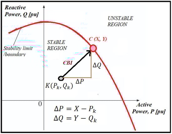 The critical boundary index (CBI) approach for VSM estimation was derived in [4] as an approach for directly approximating the real and reactive power loading distance of a power system network to the point of voltage collapse based on the criticality of the transmission lines. As shown in Figure 2, the stability boundary that describes the maximum real and reactive load that the power system can bear without the occurrence of voltage collapse (i.e., the VSM) is ruled by Equation (4). Consequently, CBI is calculated as the distance between the current operating point, K ( P k , Q k ) , and the critical point C ( X , Y ) located on the stability boundary.