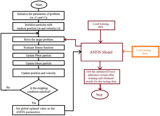 where w m a x and w m i n are the inertia weight’s final and initial values, respectively, I t and m a x i t are current and maximum iteration numbers, respectively, whilst w m a x and w m i n are taken to be 0.4 and 0.9, respectively. The fitness function of the PSO-ANFIS parameters optimization procedure is the minimization of the root mean square error ( R M S E ) which is a measure of the deviation between the target values and the predicted outputs. The simplified illustration for the implementation of the PSO-ANFIS model is shown in Figure 4 and the PSO implementation parameters, as shown in Table 1, are selected considering their previous implementation in the literature [68].