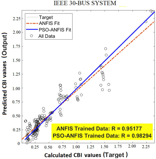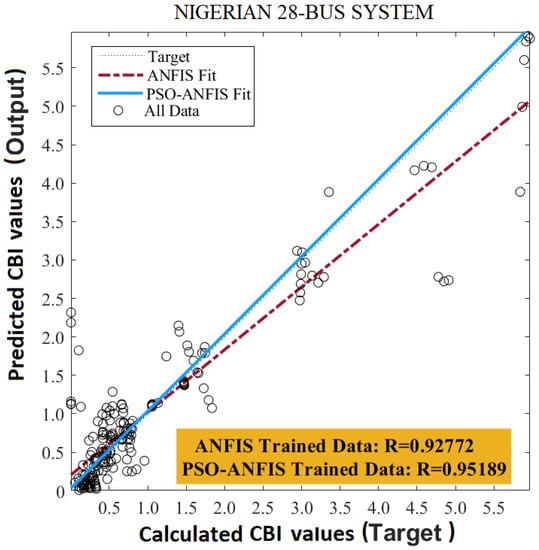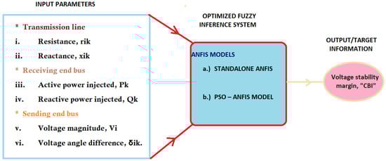 Due to the advent of artificial intelligence (AI), intelligent predictions of future events are taking the prominent stage for critical infrastructure planning and operations in recent time [10]. Different AI-based mechanisms were successfully implemented in various areas of intelligent infrastructure management, such as transportation, water supply, food processing, chemical processing, building design and construction, etc. Common AI-based prediction models include artificial intelligence-based algorithms such as regression analysis, artificial neural networks (ANNs), support vector machines, K-means, Bayesian methods, fuzzy logic, expert systems, etc., [11]. Power system networks are expensive, complex to operate, and significantly critical public infrastructures, and voltage stability monitoring is a significant aspect of its reliable operation and protection [12]. Several predictive analytics tools have been applied in the literature for solving critical power systems problems, such as load flow analysis, contingency planning, transmission congestion management, grid reinforcement planning, etc. [13,14,15]. Thus, one of the imminent prospects for the effective operation of grid infrastructures is the intelligent monitoring of the voltage stability condition of the power systems under a continuously changing loading condition. Thus, in this study, the intelligent monitoring of VSM for the effective control of voltage stability conditions is viewed as an essential tool for real-life and complex power system infrastructure management. Thus, hybridized ANFIS-based intelligent predictive models are implemented for measuring the VSM of power systems based on the concept of a critical boundary index (CBI). Credible information on vital power system parameters for ANFIS training and validation is determined from the line and bus parameters and the load flow analysis solution. The developed ANFIS and PSO-ANFIS models for VSM prediction are tested on the standard IEEE 30-bus and the Nigerian 28-bus networks. Their relative performances are evaluated and compared using adequate statistical analysis.