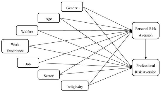 According to the risk literature, we expect statistically significant relationships between variables presented in Figure 1. We expect Iranian female accounting professionals to be more risk-averse than their male counterparts e.g., [64]. We also expect older and more experienced accounting professionals to be more risk-averse than their younger counterparts e.g., [65,66]. We expect that the risk aversion for high-earning accounting professionals will be lower e.g., [9]. Accounting professionals in the public or government sector are expected to be more risk-averse than their counterparts in the private sector e.g., [67]. Finally, we expect more religious accounting professionals to be risk-averse e.g., [68]. There is expected to be a significant relationship between personal risk aversion and professional risk aversion among Iranian accounting professionals. The related factors that might affect individuals’ risk aversion are summarized in Table 1.