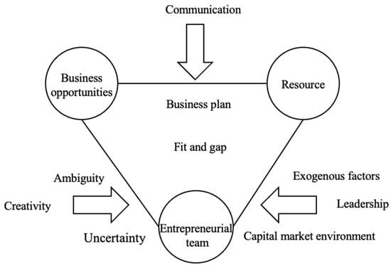 Gartner (1985) first studied the characteristics of entrepreneurs and entrepreneurial enterprises, and further proposed a dynamic entrepreneurial theory model to explain how entrepreneurial phenomena occur [58]. The model includes four elements, that is entrepreneurs, organizations, environments and entrepreneurial processes, while the four elements interact and influence each other in different ways (see Figure 1). Wickham (1998) put forward three entrepreneurial elements–opportunity, resource and organization—based on the core element of entrepreneurs [59]. He concluded that entrepreneurs would organize and integrate resources, organizations and teams to implement entrepreneurial activities after identifying opportunities. At the same time, he pointed out that entrepreneurship is a process of continuous learning. Through learning, entrepreneurs build an organizational structure and culture that match opportunities and then achieve entrepreneurial success (see Figure 2). Sahlman (1999) constructed an environment-centered four-factor entrepreneurship model, in which the entrepreneurial process is represented by the dynamic interaction between any resource, opportunity, transaction behavior and the external environment [60]. Among them, researchers include entrepreneurs, individuals or groups that provide resources and services for enterprises; opportunities refer to any market activities that may benefit in the future; trading behavior refers to contractual transactions between entrepreneurs and resource or service providers; and external environment is all external factors that are not directly controlled by entrepreneurs (see Figure 3). On the basis of predecessors, Timmons put forward the three-elements model of entrepreneurship, which regards entrepreneurial opportunities, resources and teams as the core driving factors in the entrepreneurial process; and entrepreneurship is regarded as a process of achieving dynamic balance among the three elements (see Figure 4) [61].