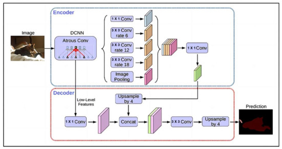 Quantitative measurements of the visual appearance of urban environments have proven challenging because visual information is inherently fuzzy and semantically poor. To address this problem, this study relied on street images as agents of city appearance and used the newly developed image semantic segmentation technology to analyze city scenes in terms of scene elements [48]. DeepLabv3+, proposed by the Google team in 2018, was selected for the semantic segmentation of street pictures. This model is the latest optimized version of the DeepLab series of models, reflecting the state of the art [49]. Figure 2 shows the structure of this model.