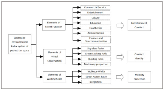 Pedestrian street space is a complete system of interaction with walkers, and it is a comprehensive factor that affects residents’ destinations and travel routes. In this study, the influencing factors of pedestrian street space are divided into three aspects: the choice of travel purpose, the perception of the travel environment, and the structure of travel space. Correspondingly, the index of the walking index model is divided into three categories: street function represents the travel purpose, travel environment represents the visual perception, and spatial structure represents the travel scale.