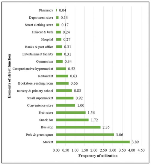Lu [54] investigated pedestrian street functional elements in daily life and identified 20 common street functional elements, as well as their frequency of utilization, as shown in Figure 4.