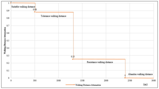 Walking distance attenuation refers to the phenomenon that the mutual attraction between origin and destination tends to weaken with increasing walking distance for physiological and psychological reasons related to walkers. Thus, walking distance attenuation reflects the change of people’s walking willingness with the travel distance, which means that people’s willingness to walk decreases with the increase of walking distance generally. When daily travel is accomplished by walking, the attenuation coefficient of facility distance at the destination follows the law of walking distance attenuation.