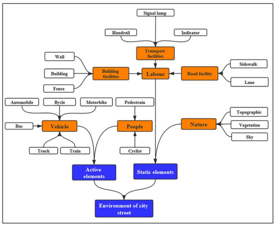 Supplementing existing walkability measures with data collected from street images using computer vision techniques is an efficient approach [56]. Daimler-Benz released the evaluation data set Cityscapes, which contains 5000 images of the high precision level annotation and level of more than 20,000 pieces of rough annotation of images. The images come from more than 50 different urban spaces in cities, street elements and backgrounds, and 30 physical elements’ annotations including traffic signs, traffic actors, plants, and buildings. Based on commonality and importance to the street, the 19 categories’ images were selected for instance segmentation during the test and were included in the calculation (Figure 6).