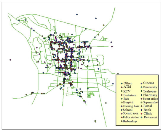 Among the 1008 street functional elements obtained, the two categories of commercial services and education accounted for more than 50%, and the distribution of various street functional elements was relatively concentrated, primarily on the axis of main pedestrian streets in the downtown area, which is shown in Figure 8 and Figure 9.