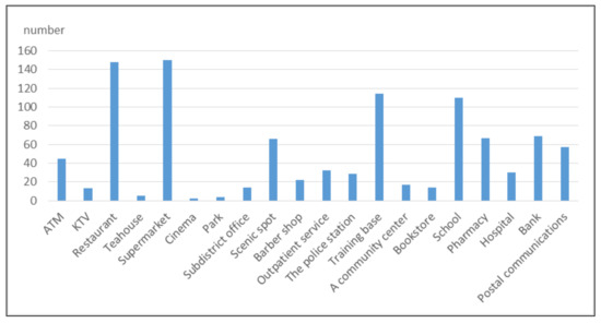According to the weight of different functional elements, street functional elements are divided into two categories by service type, as shown in Table 3. The first category is defined as homogeneous functional elements, which are the service facilities that are frequently used in daily life, such as convenience stores, pharmacies, communication business services, etc. The quality of service provided by these elements varies little, so people choose them according to the principle of proximity. The second category is defined as heterogeneous functional elements, whereby the quality of service of which is determined by the characteristics of the elements and differs greatly due to market competition. Their appeal is relatively insensitive to walking distance, and people are more likely to accept longer walking distances, within the affordable range, to access them.