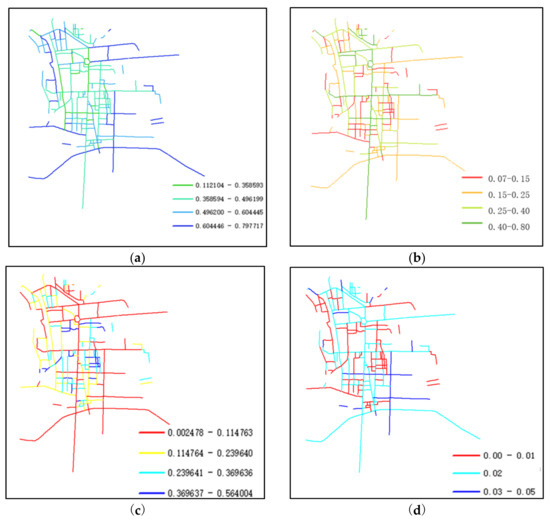 In the process of implementation, Global Integration () is expressed by the inverse of , which makes it easy to compare streets in the whole street spatial network system.