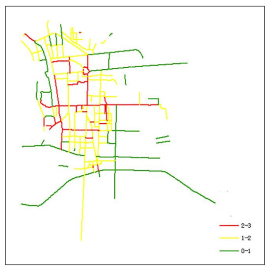 The overall integration represents the accessibility of roads in the global road network system. Streets with a higher overall integration have a higher attraction to the aggregation of street social functional facilities due to the larger people flow. When the value is greater than 1, the agglomeration effect of street elements is stronger. When the integration is between 0.4 and 0.6, the layout is more scattered. In the study of the pedestrian street network in the middle and small-medium cities, the overall integration degree represents the pedestrian agglomeration effect of one street in the axis space relative to other street axis space. It reflects the relative advantages of the street axis in the overall street spatial network in terms of accessibility and penetration interaction.
