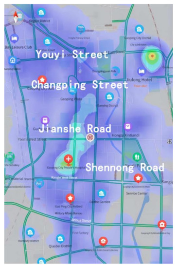 According to the road network score, it can be found that Jianshe Road, Changping Street, Shennong Road, Youyi Street and other roads have higher scores (of more than 60 points), and generally belong to the roads with good road environmental conditions. At the same time, combined with the thermal distribution of travel demand on the Baidu map (shown in Figure 12), it can be confirmed that the areas where residents’ travel demand is more concentrated are exactly matched with roads with a road environment score. This means that the study’s scoring system can reflect the real conditions of the road.