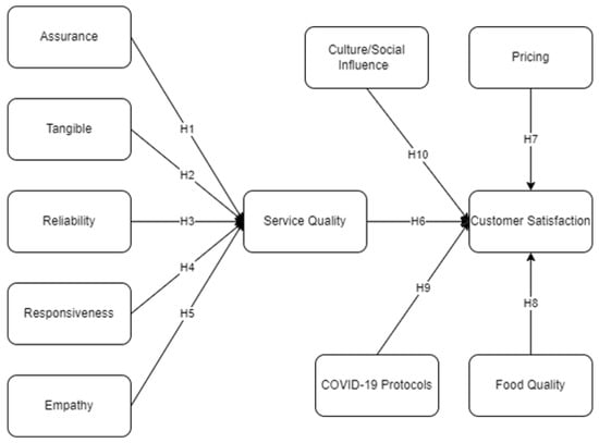 In analyzing customer satisfaction, factors such as the pricing, food quality, cultural influence, and the SERVQUAL dimensions could be utilized. The SERVQUAL dimensions have been adapted and utilized in numerous studies in different service settings, geographic locations, and cultural contexts [22]. In the UK, Nguyen et al. [23] conducted a study in fast food restaurants regarding customer satisfaction using the SERVQUAL dimensions. The study of Nguyen et al. [23] found that tangibles, reliability, responsiveness, assurance, and empathy had a significant positive effect on customer satisfaction. In Australia, a similar study was also conducted by Lee and Hing [24]. They measured the quality of restaurant operations using the SERVQUAL dimensions. However, both the study of Nguyen et al. [23] and Lee and Hing [24] only considered the SERVQUAL dimensions as a factor in determining customer satisfaction. Other factors that may influence customer satisfaction may also include the price and product quality. Moreover, these studies only used a small sampling size, which was conducted before the occurrence of the COVID-19 pandemic. Finally, in the Philippines, the effects of customer service quality and product quality on customer satisfaction and customer loyalty were studied by Altejar and Dizon [17]. The findings of the study of Altejar and Dizon [17] showed that customer service quality and product quality affect customer satisfaction, while customer satisfaction affects customer loyalty. In addition, product quality and service quality were included in the study as factors affecting customer satisfaction. Another factor that may influence customer satisfaction such as price, may also be included to have a better perspective on the economic effect of the COVID-19 pandemic [13,25]. Most of the SERVQUAL model is often utilized in service quality and application [12]. Thus, it will be interesting to investigate the model’s applicability in fast food restaurants, especially when combined with price, cultural influence, and product quality as an additional factor during the COVID-19 pandemic.