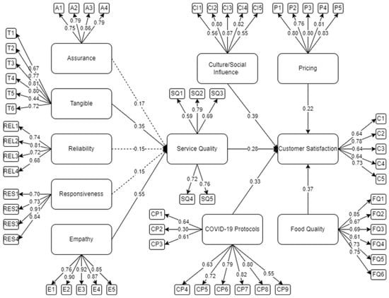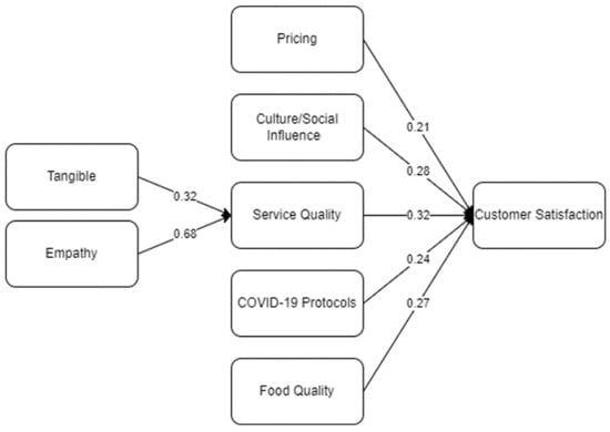 Figure 3 represents the initial SEM model of the study. From Table 2, it was found that pricing, culture/social influence, tangibles, empathy, COVID-19 protocols, overall service quality, and food quality were significant to customer satisfaction. However, responsiveness, reliability, and assurance yielded insignificant results. In addition, some of the indicators under tangibles and COVID-19 protocols, such as T5 and CP2 were observed to have low factor loadings (less than 0.05). Thus, a revised model, which is shown in Figure 4, was derived by eliminating the mentioned variables and indicators [13]. Moreover, modification indices were performed to enhance the model fit of the study [14].