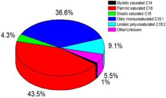 Currently, palm oil is one of the world’s the most familiar raw vegetable oils, and its overall usage is 33% in India. Palm oil in India and other countries is used as a regular cooking oil. In a European country, palm oil use was 51% in the year 2017, to control emission from automobiles and trucks. The production of palm oil in India began in 1991 with 5000 tons, which increased to 200,000 tons in 2018. It is estimated that palm oil usage will be more than 9.3 million tons by 2030. As the local production is restricted, enormous imports are unavoidable. Figure 1 shows the amount of fatty acids in palm oil [31].