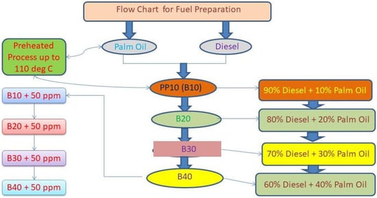 The raw oil is not used directly in the DI diesel engine due to high viscosity and density of the fuel. To reduce the high viscosity and density of the fuel, two main methods are used. One is the transesterification procedure to deliver biodiesel and the other method is the preheating process, which is the latest one [32]. In the preheating process, time consumption is very less relative to the transesterification method. Crude palm oil was poured into a heat exchanger and heated up to 110 °C to decrease the viscosity and density [33,34,35,36,37]. Figure 2 shows that Fuel preparation flow chart. Diesel was added in various ratios (i.e., 90%, 80%, 70%, and 60%) and mixed with the preheated oil. Various blends were prepared to investigate and termed as B10, B20, B30, and B40 [38]. To determine the chemical and physical properties of various blends, they were tested as per the ASTM standards. Table 3 shows the properties of various fuel blends. The properties of the test fuel and diesel are very close to each other due to the preheating process. Preheated oil was used in a conventional base engine without any major modificationshows the process for preparing the fuel.