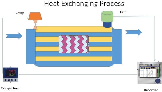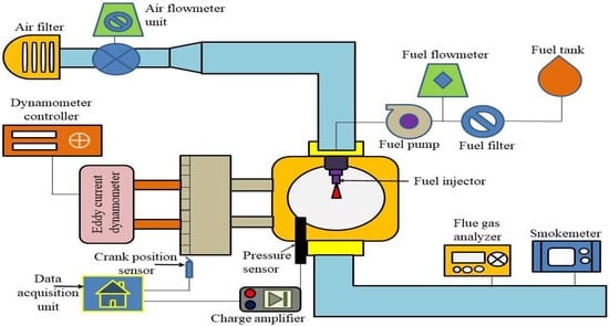The experiments were carried out in a single-cylinder four-stroke conventional base engine, as shown in Figure 3, which illustrates the experimental setup. An eddy current and torque dynamometer was coupled with a diesel engine. Initially, the diesel engine was warmed up and run up to 30 min to achieve the stabilized condition [39]. A smoke meter and an exhaust gas analyzer were used to measure the quantity of the CO and smoke opacity emissions in the tailpipe. The gas analyzer was used to determine the various emissions such as NOx, CO, HC, and CO2 emitted from the base engine whereas the smoke meter was used to measure the smoke opacity. The emission parameters are discussed in Sections 4.3–4.5 [40]. Raw oil was directly used in the conventional engine as due to its high density and viscosity. To lessen the density and viscosity, transesterification and preheating processes were used. The preheating process was conducted using two types of heater and heat exchange process [41,42,43]. The oil was heated at a constant temperate of 110 °C with the help of a temperature-reading instrument. Figure 4 shows that heat exchange process.