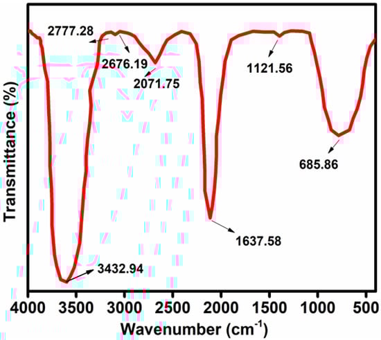 The outcomes of Fourier transform infrared (FTIR) examination are shown in Figure 5. In the figure various stretches of bonds appear at changed peaks; N–H bonds of value 3432.94, single aldehyde of 2777.28, C–H, O–H bonds of 2676.19; C≡C bonds of 2071.75, C=C bonds of 1637.58, and C=O bonds of 1121.56. The peaks close to 3464, 2935, and 2867 cm−1 are attributed to extending OH bond and C–H extending of aldehydic individually. The bands at 1632 cm−1 are related to amide emergence because of carbonyl length. The peakat 1055 cm−1 relates to extending the reverberation of the amine C–N. The peak at about 1753 cm−1 is correlated to extending the bond of C=C. The peak close to 841 cm−1 is attributed to C=CH2 and the peaks close to 682 and 658.94 cm−1 are due to out-of-plane bending. The bond CH reverberation is CH=CH of subbed ethylene frameworks. The FTIR spectra of silver nanoparticles displayed unmistakable peaksat 2927.78, 1631.45, and 1383.65 cm−1. The sharp peak at 1641 cm−1 indicates solid ingestion in the bond because of to the extending vibration of C=O (NH) gathering [44,45,46,47,48]. The 1393 OF band produced for C–N and C–C extending; the nearness of the top at 2927 cm−1 was doled out to extending reverberation separately C–H and C–H.