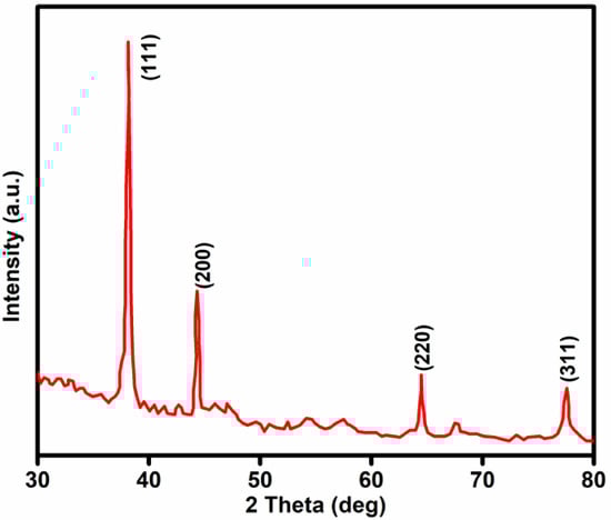 The nanoparticles prepared were studied using powder XRD. Figure 6 shows the XRD pattern of silver nanoparticles. The figure unmistakably shows the sharp peaks at (2θ) 39.20, 45.57, 65.58, and 78.87 relating to the (111), (200), (220) and (311) planes, respectively. Comparing JCPDS (card no. 89-3722), green-incorporated AgNP sample was found to have an FCC structure with normal crystallite size.