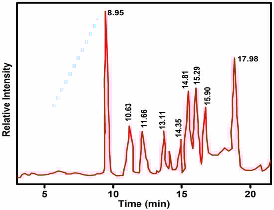 In this examination, the concentrates of methanol in preheated palm oil recognized the nearness of 9th significant mixes with the particular weight of sub-atomic and territory as appeared by the nearness of different top shown in the figure. Mixes were distinguished by examining their discontinuity of mass [49]. 1,3-Dioxane has a capacity to fight malignant growth and parasitic infection. Likewise, numerous studies have shown that carboxylic utilitarian gathering present in the concentrate has antibacterial and anticancer actions. Figure 7 shows the gas chromatography–mass spectrometry (GC-MS) analysis of palm oil.