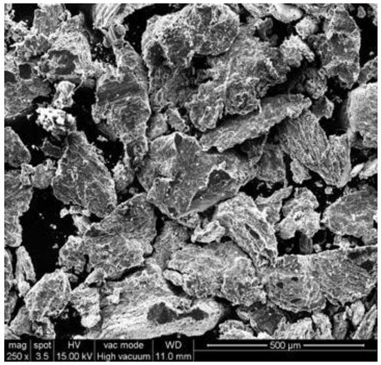 The silver nanoparticles were synthesized using 25 mL palm oil. Silver nanoparticles were added to 230 mL of 0.001 M deionized water and mixed all together [50]. The mixture was stored in a shaker bottle at 150 rpm at room temperature. Shading adjustments at the subsequent arrangement were performed at regular intervals by calculating absorbance at 380–720 nm using UV noticeable spectrum rays [51,52,53,54]. The shaker rotated at 11,000 rpm for 35 min and the obtained product was cleaned three times with refined water, deionized water, and lastly with ethanol, and then put away at −45 °C for additional examination. Figure 8 shows the SEM images of silver nanoparticles.