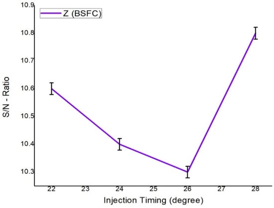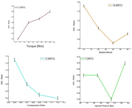 Figure 10 shows the effect of S/N ratio on the BSFC with respect to torque for the various optimization parameters used in the diesel engine. Generally, the BSFC of diesel engine is inversely proportional to the BTE [61]. The BTE was increased and BSFC was decreased in the conventional diesel engine. The blend, torque, ignition timing, ignition pressure, and compression ratio were varied in the diesel engine to find the best optimum results in the conventional engine. The S/N ratio with the better-the-lower attributes can be used to calculate the BSFC. The outcomes were replaced by 2 and the calculated values had S/N ratio for all returns variables. These values were optimized for various engine parameters. The optimized results were obtained for 5 Nm engine torque (V), biodiesel 30% and diesel 70% + silver nanoparticles 50 ppm (B30) (W), injection timing 27 bTDC (Z), compression ratio 17.2:1 (X), and ignition pressure 205 bar (Y). B30 showed the optimum results for the S/N ratio value of 9 compared to the other blends. With an increase in the compression ratio, the S/N ratio value was decreased compared with other CRs. The optimum results were obtained for 18.1:1 compression ratio. With an increase in the torque, the S/N ratio value was increased to achieve the optimum result at 5 Nm. The injection timing (26 crank angle degree before top dead center, bTDC) and injection pressure were obtained for calculating the optimum results and the results then compared with the other injection timings and pressures (V1W3X4Y3Z3).