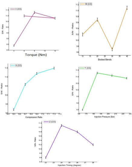 Figure 11 shows the S/N ratio for carbon monoxide variation with torque for the various optimization parameters adopted in the current engine. The formation of carbon monoxide in the diesel engine was because the fuels did not burn completely during the combustion process [62]. The S/N ratio of carbon monoxide with the better-the-lower characteristics can be used. The outcomes were replaced by 2, as shown in Figure 6. The obtained results were the S/N ratio value for all returns variables. With an increase in the torque, the S/N ratio was also increased, and achieved the optimum value at 5 Nm (V) torque, which was then compared with the optimum torque values of others. The blends B30 + 50 ppm silver nanoparticle showed the lowest S/N ratio value of 9.7 compared with the other blends. The S/N ratio for the optimum result of B30 (W) was 9.7 compared with the other optimum blends. With an increase in compression ratio, the S/N ratio values were also increased to achieve the optimum result of 17.2 for CR (X) compared with the other CR optimum results. With an increase in the injection pressure, the S/N ratios were also increased and suddenly dropped at 185 bar pressure but showed optimum results at 165 bar (Y) compared with the S/N ratios of other injection pressure. When the injection timing was increased, the S/N ratio increased up to 22 IT and dropped suddenly and then achieved the optimum value of 27°bTDC (Z) compared with the other injection timings. These values were optimized in various engine parameters obtained (V1W3X4Y1Z4) [63].
