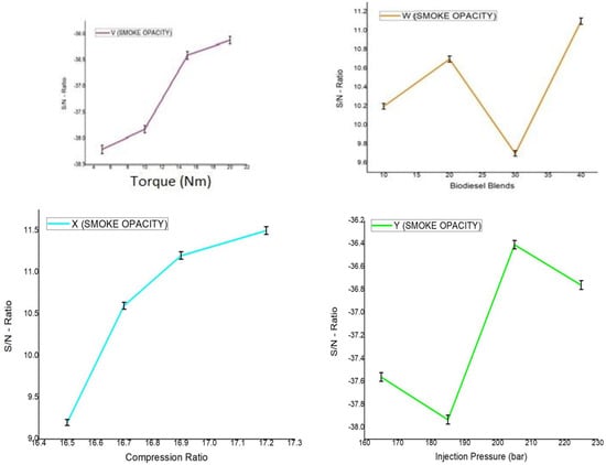 Figure 12 shows the S/N ratio of smoke opacity with operating torque for the various optimization parameters used in the diesel engine. Formation of smoke opacity emission increased the temperature andamount of soot particles. The smoke opacity, the S/N ratio with the better-the-lower attributes can be used [64]. The results were replaced by 2; their estimated results were the S/N ratios for all returns variables. With an increase in the torque, the S/N ratio was also increased to reach the optimum results for 5 Nm torque compared with the other torque. The smoke opacity for the biodiesel blend B30 + 50 ppm silver nanoparticle showed the lowest S/N ratio and optimum results compared with that of the other blends. When the CR was increased, the S/N ratio also increased compared with the CR. Optimum results were obtained for 16.9 CR compared with the other compression ratios. On increasing the injection pressure, the S/N ratio also increased and then decreased and achieved optimum results for 185 bar compared with the other blends. With an increase in the injection timing, the S/N ratios were increased and dropped suddenly at IP 24 and showed a better injection timing at 26 IP compared with the other injection timings. These values were optimized for various engine parameters obtained (V1W1X3Y2Z3). Table 8: S/N value for output returns and Table 9: S/N ratios at the various factors range.