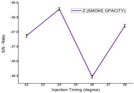 The optimal test results are substituted in the Equation (3) to all returns factors such as carbon monoxide, BSFC, and smoke opacity to determine the S/N ratio in Figure 11. The diesel engine parameters for optimization results obtained were V1W1X3Y2Z3. From Equation (3), the value of smoke opacity was determined as 109.66 [73].