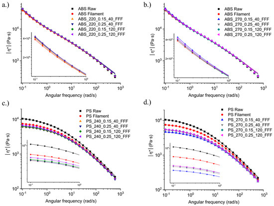 Effect of processing steps and processing parameters on the complex viscosity of ABS printed at (a) 220 °C and (b) 270 °C and of PS printed at (c) 240 °C and (d) 270 °C. Symbols: experimental data points, lines: modified Carreau–Yasuda fitting.