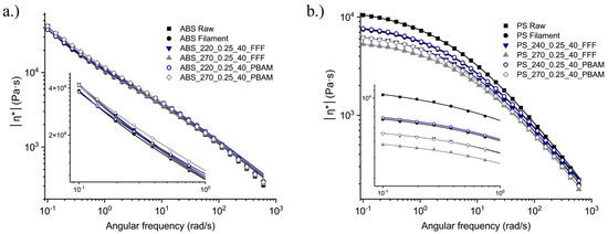 The effect of the filament manufacturing via single screw extrusion (SSE), the 3D printing via FFF, and the FFF processing parameters (printing temperature, layer thickness and printing velocity) on the complex viscosity of ABS and PS are shown as a function of the angular frequency in Figure 3. The results for the raw materials are added in all graphs for comparison. In the case of ABS printed at 220 °C (Figure 3a) and at 270 °C (Figure 3b), no major differences can be seen. This indicates a limited amount of structural changes as a result of processing, including the filament fabrication, consistent with the work of Jagenteufel et al. [35]. Even though the time sweep tests (Figure 2) show an increase in the complex viscosity of ABS with time, the materials have now been subjected to thermal and mechanical stresses. The latter stresses may have caused a certain level of chain fission, which decreases the viscosity and average molar mass of the material, compensating cross-linking increases. In contrast, in the case of PS (Figure 3c,d), it is clear that the processing leads to structural changes (with lower chain lengths) because of degradation. The filament fabrication reduces the complex viscosity of PS, which is further decreased after the FFF process, especially if the material is processed at 270 °C.