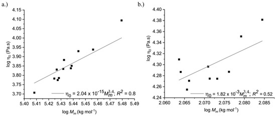 The scaling of with Mm for ABS and PS is shown in Figure 5, and is based on the well-known equation for linear polymers: [60], in which K is a proportionality factor and α = 3.4. For ABS (Figure 5a), the values for the PBAM samples are not included to increase the correlation potential; however, a rather weak correlation between both properties is still observed as evident from a low coefficient of determination R2. It should although be admitted that the Mm variation range is rather small compared to a standard range to identify a 3.4 type of power. The data for the ABS FFF samples are also rather scattered, revealing that the FFF process does not lead to very clear systematic variations, even though both properties are decreased after this processing step. In contrast, as shown in Figure 5b, PS samples exhibit a stronger correlation between both properties, indicating that the processing parameters strongly influenced the degradation. This is also obvious from the larger Mm range in Figure 5b compared to Figure 5a.