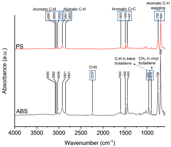 Further analysis is possible via the consideration of FTIR results. Consistent with literature data [61], important peaks can be assigned for raw PS and ABS, as shown in Figure 6. For the other samples, the spectra are included in the Supporting Information (Figure S1). Because styrene is present in both PS and ABS, several peaks are shared between these materials including two aliphatic CH stretching signals at around 2920 and 2850 cm−1, 3 to 5 aromatic CH stretching signals between 3000 and 3100 cm−1 and two aromatic CH wagging signals at approximately 700 and 750 cm−1, with the second one at one third of the height of the first one. ABS presents extra peaks, which are attributed to triple CN bond of the acrylonitrile group at 2237 cm−1 and two peaks that refer to the PB phase. They are centered at 965 and 910 cm−1, and represent stretches regarding CH in trans butadiene and CH2 in vinyl butadiene [62].