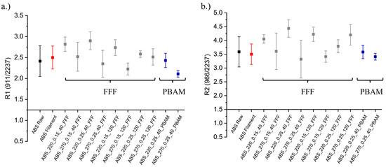 To assess the degradation of the PB phase in ABS it has been recommended to mainly inspect the variation in the ratios R1 and R2 (Equations (1) and (2)) [41], with the results in the present work shown in Figure 7. Upon comparing the results for the filament and samples prepared via FFF and PBAM with the raw material, no (clearly) statistically significant differences are seen for both R1 and R2, highlighting that FTIR can be less sensitive than rheological analysis.