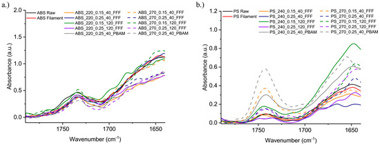 It is interesting to evaluate oxygen-related FTIR peaks [63] as well, noting that such moieties may also be due to the presence of additives [64,65]. Originally, ABS and PS have no hydroxyl (~3296 cm−1) or carbonyl groups (~1723 cm−1), nor peaks in the region of C-O stretching vibrations (~1000–1300 cm−1). Nevertheless, it has been indicated that thermo-mechanical degradation may induce several reactions that can be responsible for the appearance of a wide range of oxidative moieties [63,66]. Due to the limited amount of oxygen in the polymer melt, it is at first sight unlikely that radicals are easily converted in peroxy radicals [67], so that the FTIR spectra may present no (significant) changes regarding the peaks of hydroxyl, carbonyl or other C-O stretches. Indeed, in the present work, no major changes are found for ABS, as shown in Figure 8a for the carbonyl region and in the Supporting Information for the hydroxyl and C-O stretches regions (Figure S2). However, in previous work [32], FTIR spectra of mass polymerized ABS samples manufactured via FFF and PBAM have been compared and samples prepared via FFF displayed larger peaks around 1250 and 1750 cm−1, which regards C=O and C-O stretches in ester moieties, indicating the more pronounced degradation of ABS via FFF. This can be related to the different processing conditions in that work or to the different type of ABS (mass polymerized vs. emulsion polymerized).