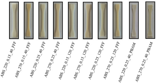 One of the possible outcomes of degradation due to processing is yellowing [56,63,69]. Such discoloration is attributed for the formation of carbonyl substituents during thermo-oxidative degradation, although as in the present work a yellowing is not automatically captured FTIR sensitivity wise specifically for low oxygen contents (cf. Figure 7 and Figure 8). It should be realized that a color change is likely undesirable and may limit the range of applications of the materials, especially in case aesthetics are important. A visual inspection of the ABS specimens produced via FFF and PBAM, as incorporated in Figure 9, confirms the yellowing due to processing. This feature is more pronounced for the specimens produced via FFF at 270 °C, whereas PS samples did not show any visual color changes, as can be seen in Supporting Information (Figure S4).