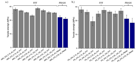 Comparison of tensile strength of: (a) ABS; and (b) PS specimens printed via FFF and PBAM.